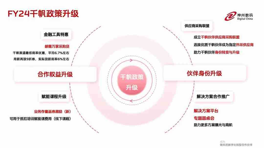 会议伊始,,,,9001cc 以诚为本数码中台副总经理朱斌为与会成员做FY24千帆计划政策介绍,,,以AI驱动的数云融合体系框架为基础,,强调企业积累的数据资产可以创造更多应用场景和价值,,对未来业务增长和企业成长起到关键作用。。。基于这一背景,,,他阐述了会议的主题共话AI未来,,,并从合作权益升级和伙伴身份升级两个方面解读了千帆计划的新升级政策。。。。