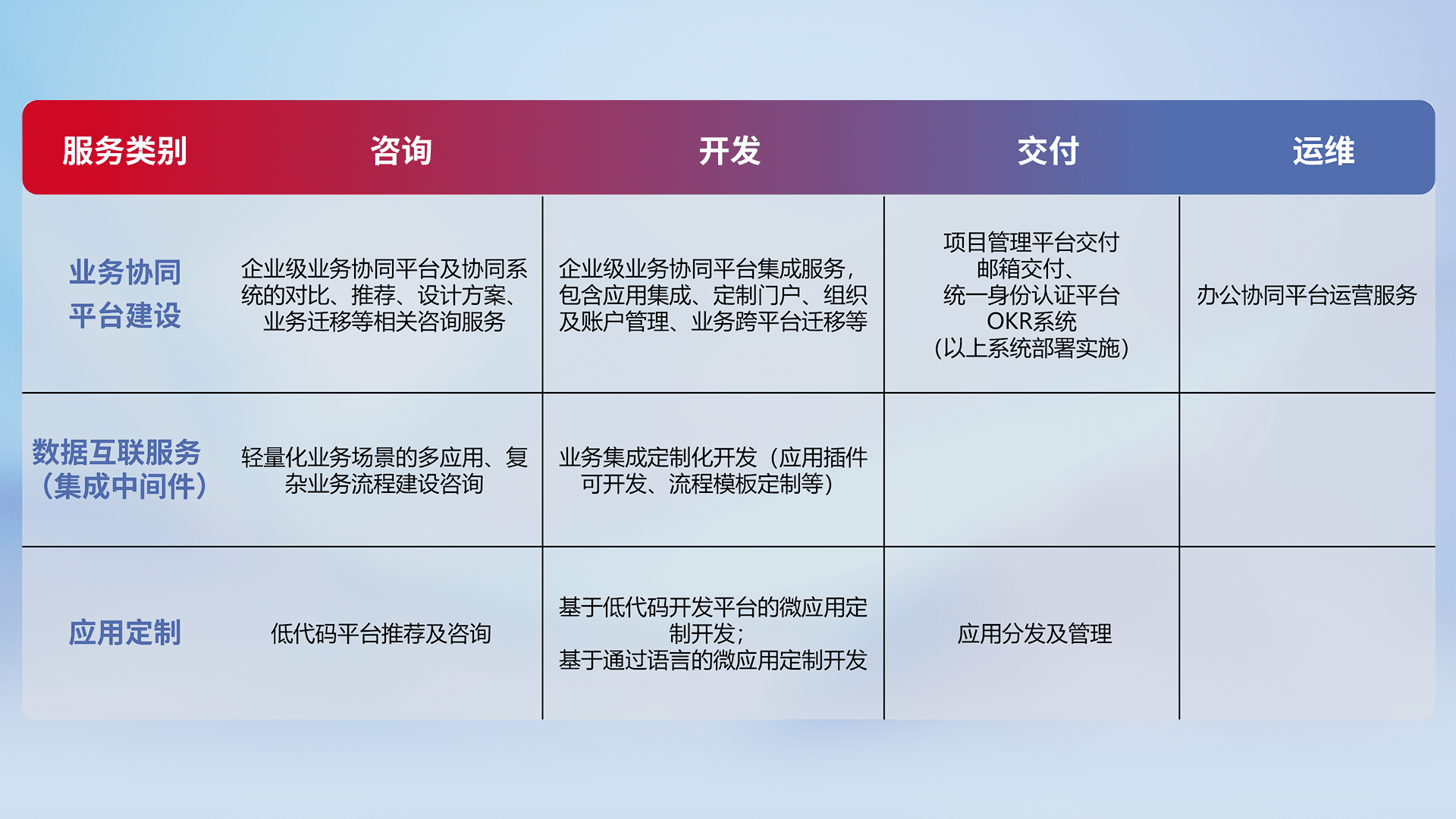 针对钉钉、、、企微、、、、IDaas等平台级产品提供产品的规划、、方案、、交付、、、、定制化开发等服务,,实现如统一协同办公、、、智能客户服务、、、混合会议管理、、、智能数据查询、、、、等业务场景,,实现数字化转型。。。