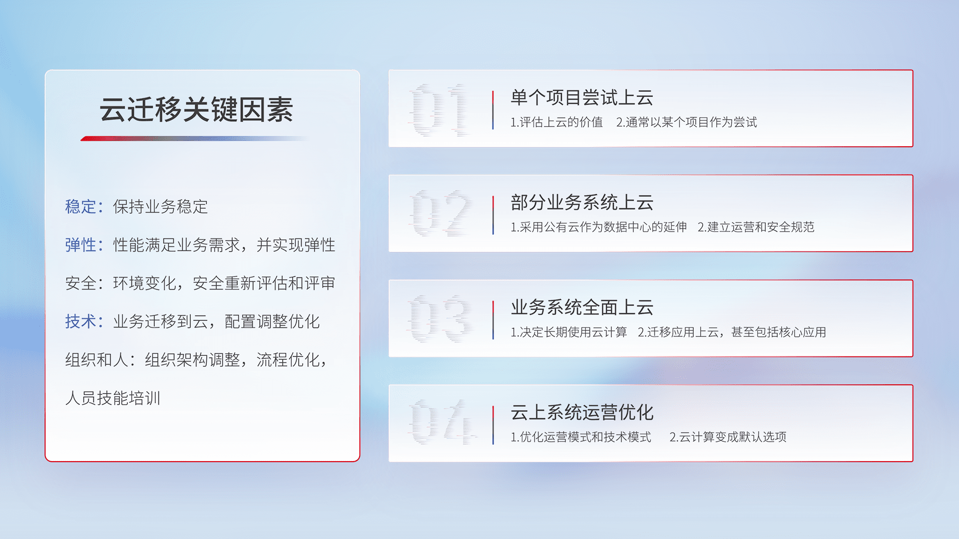 结合实际业务,,,,从规划设计、、、、云平台选型、、云原生改造、、数据迁移、、、、集成交付,,迁移全过程为客户识别最佳上云路径,,,,做好风险识别管理,,设计网络架构、、、身份权限、、、、安全审计合规、、、、操作审计、、、、日志审计、、、监控告警策略、、、、多站点容灾设计等,,对云上基础设施进行整体规划,,,提升IT治理水平,,,以满足弹性、、高可用、、高性能的需求。。